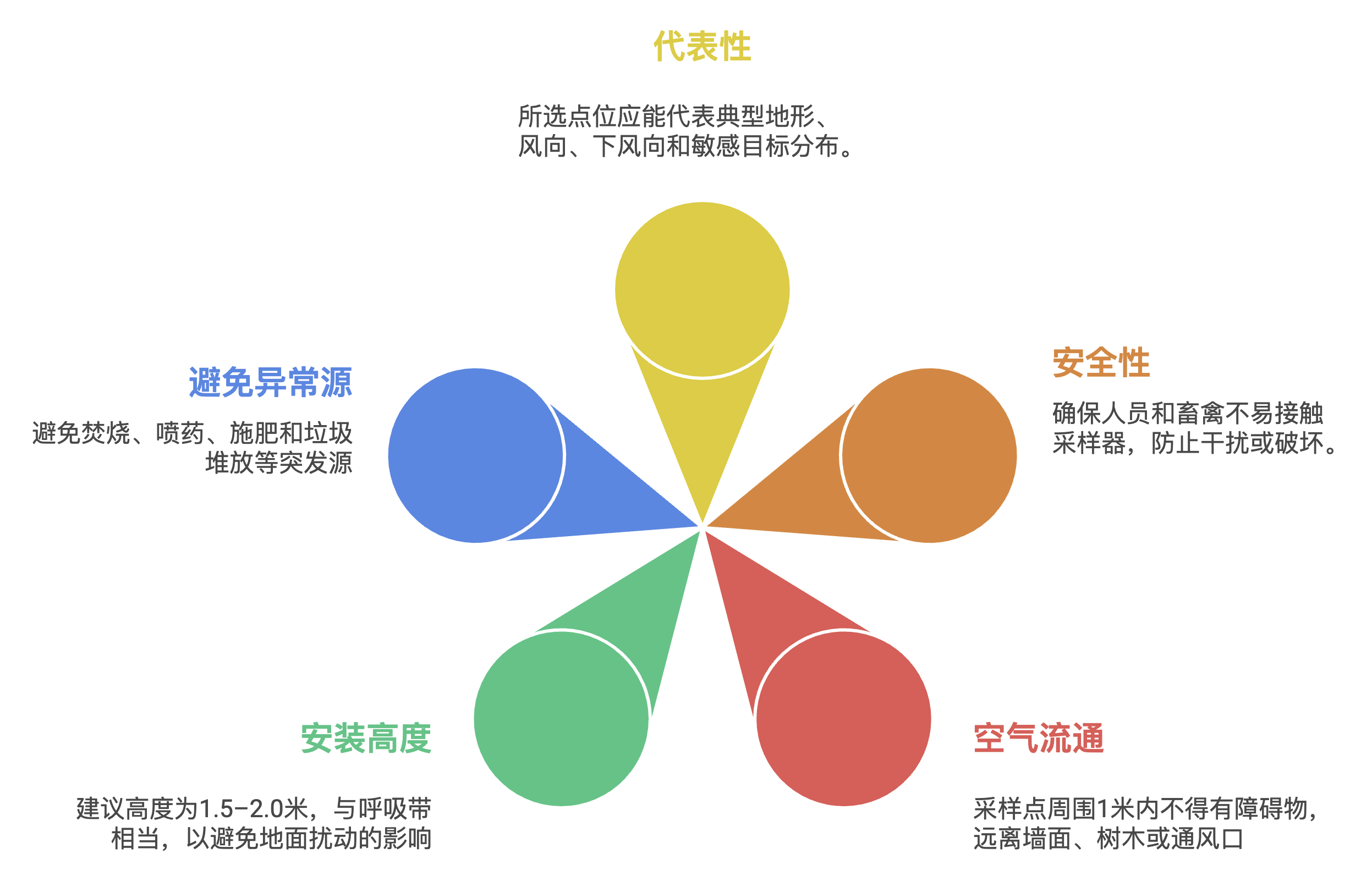 在畜禽養(yǎng)殖區(qū)域、鄉(xiāng)村地區(qū)及背景區(qū)開(kāi)展氨氣監(jiān)測(cè)時(shí),被動(dòng)采樣器以其結(jié)構(gòu)簡(jiǎn)單、布設(shè)靈活、無(wú)需供電的優(yōu)勢(shì),成為環(huán)境空氣監(jiān)測(cè)的重要工具。為保證監(jiān)測(cè)數(shù)據(jù)具有代表性和可比性,采樣點(diǎn)位的科學(xué)選取和合理布設(shè)至關(guān)重要。